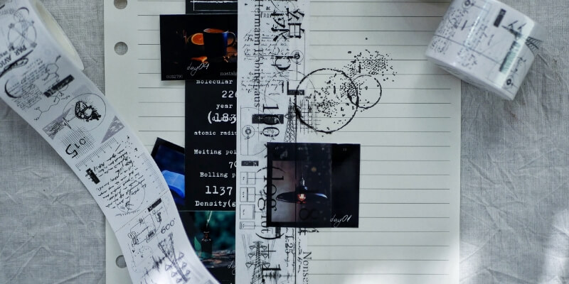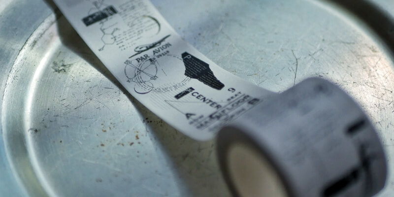 ミシン目入りのロール付箋。 高くそびえたつ鉄塔や走り書きされたメモ、太陽の通り道である「黄道」のデザインなどをレイアウトしたロール状の付箋。 静かな印象になるように、無彩色でデザインを完成させました。 また、ロール状の付箋には15cm間隔のミシン目を入れてあるので、切り取りしやすいようになっています(掲載写真参考)。 付箋の紙質はツヤのない上質紙でマットな質感です。付箋裏面は、何度も貼ったり剥がしたりできる弱粘再剥離タイプの糊が施されています。