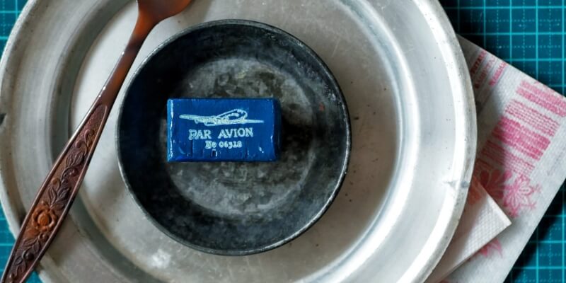 フランス語で航空便を意味する「PAR AVION」。 スタンプの持ち手部分は、深みのあるブルーに塗装して仕上げた小さめのスタンプ。 コラージュなどのクラフトワークに是非お役立て下さい。