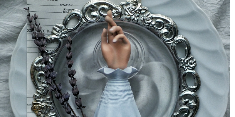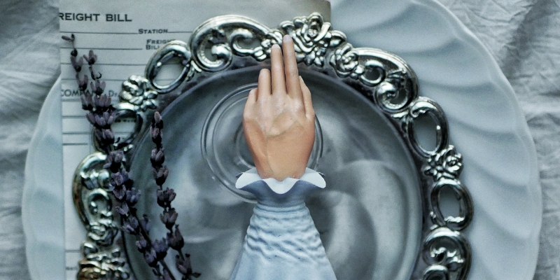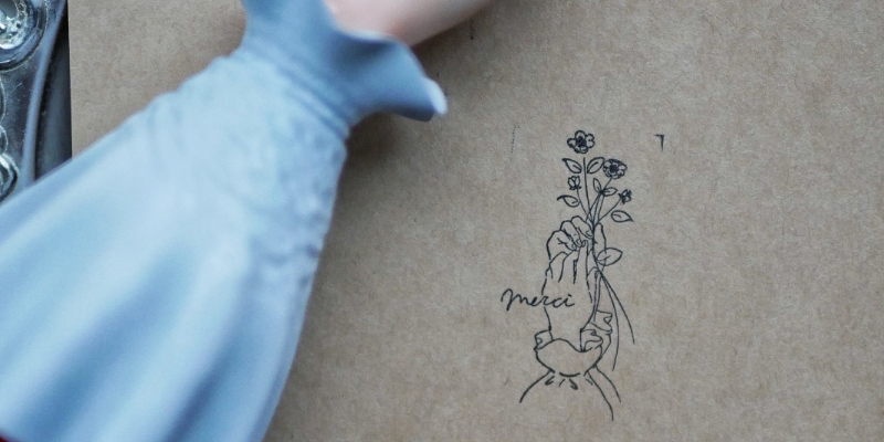 ドレープ感たっぷりのブラウスを身にまとった『手』。 スタンプの持ち手となる部分を、人間の『手』にした作品。3Dプリンターで精巧に作り上げた『手』は、とても美しく儚げ。 手の甲の血管やドレープたっぷりのブラウスがリアルに再現されるまで、何度も試作を重ねた作品です。 ゴム印部分は、両の手でそっと花を包む様をデザインしました。「merci」の感謝の言葉を添えて、シンプルだけど印象的なスタンプデザインを描きました。