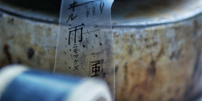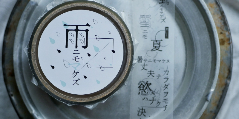 1931年に宮沢賢治が書いたとされる詩「雨ニモマケズ」。透明テープには、自然との調和が述べられている冒頭部分を印字しました。自然への畏敬と、すべての生きとし生けるものへの深い慈しみが、冒頭部分に込められているように感じ、この部分をテープにしました。 詩の世界観を壊さぬよう、シンプルなデザインにした透明テープ。