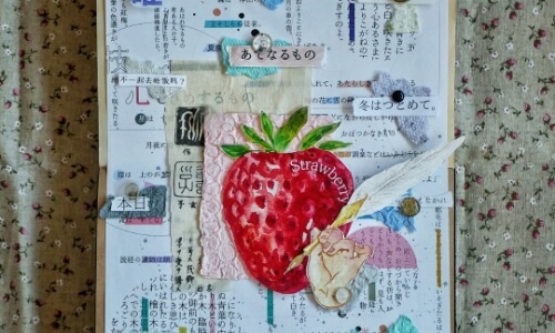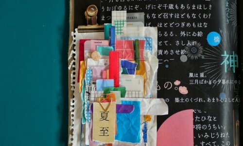 デザインペーパーをコラージュ背景に使ったノートコラージュ。文字色に合わせて、コラージュ素材もカラフルな端紙を使ってコラージュ。写真のように、たくさんの紙を重ね合わせることが多いです。