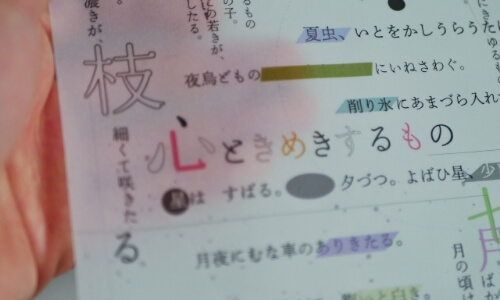 学生時代は、古文があまり好きではなく、授業も上の空状態。清少納言の鋭い感性でつづられた枕草子も、例にもれず好きではありませんでした。時をだーいぶ経て、改めて読み解くと、まーなんて細やかな感性なのでしょう!とその世界に夢中になってしまいました。特に42段にあたる「あてなるもの」。削り氷(ひ)にあまづら入れて、あたらしき鋺(かなまり)に入れたる。とても短い文章なのに、新しい金属製の器の冷たい感触、シャリシャリとする氷の食感を感じる素敵な段落です。