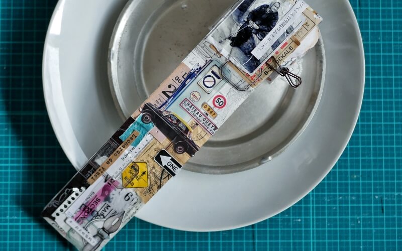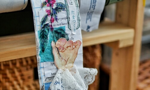 紙だけでなく、布素材もコラージュに取り入れると単調なコラージュにメリハリが出るのでおススメです。