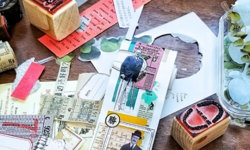 レシートコラージュは、長さはありますが、幅は小さいのでコラージュ素材の配置がしやすいです。また、コラージュ素材は、厚みのある素材は使わないのが無難です。どーしても使いたい時は、思い切り使います!笑